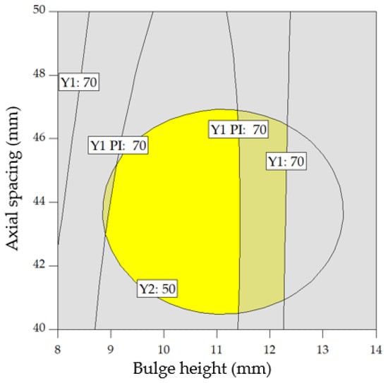 The optimization was conducted under the condition of a forward speed of 7 km/h. The multi-objective optimization solution was obtained using the optimization module of Design-Expert 10.0.4 software (Stat-Ease Inc., Minneapolis, MN, USA). The optimization results are displayed in Figure 11. The optimized parameters were selected as follows: a forward speed of 7 km/h, an axial spacing of 40.7–46.8 mm, and a bulge height of 9.3–11.5 mm, where the soil adhesion is less than 70 g and the forward resistance is less than 50 N.