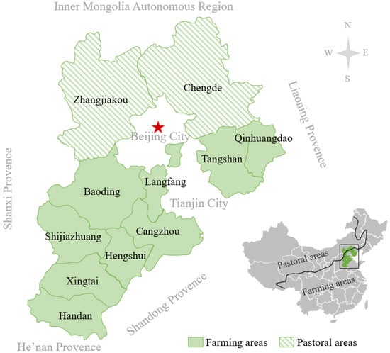 Selecting representative survey areas and conducting interviews were an important part of the survey. Hebei Province, in the north of China, has both farming and pastoral areas, being rich in beef cattle production varieties and modes, and is an important beef cattle industry province. According to the “China Agricultural and Rural Statistical Yearbook”, in 2020, the number of slaughtered beef cattle in Hebei Province was 3.35 million, and the beef output was 0.56 million tons, accounting for 7.34% and 8.26% of the national output, respectively. Furthermore, many beef cattle trading markets (such as the Zhangsanying market in Longhua, and the Qipanshan market in Weichang County) have been formed as part of the long-term industrial development of the country. Hebei, which plays an important role in China, is a typical and representative area of calf production. Calves are supplied to other regions with developed beef fattening industries, such as Henan, Shandong and Jiangsu in this case. Figure 1 shows the surveyed areas.