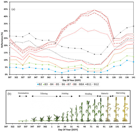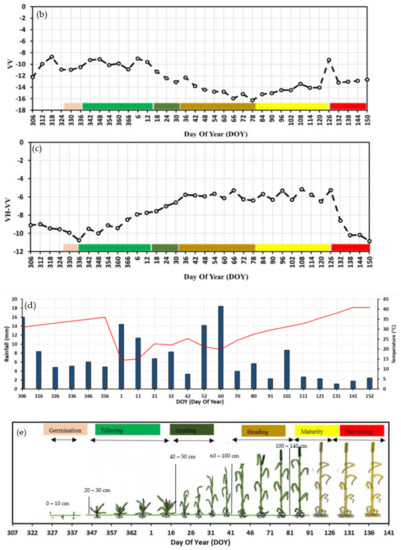 - Nasrallah, A.; Baghdadi, N.; El Hajj, M.; Darwish, T.; Belhouchette, H.; Faour, G.; Darwich, S.; Mhawej, M. Sentinel-1 data for winter wheat phenology monitoring and mapping. Remote Sens. 2019, 11, 2228. [Google Scholar] [CrossRef]