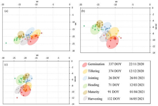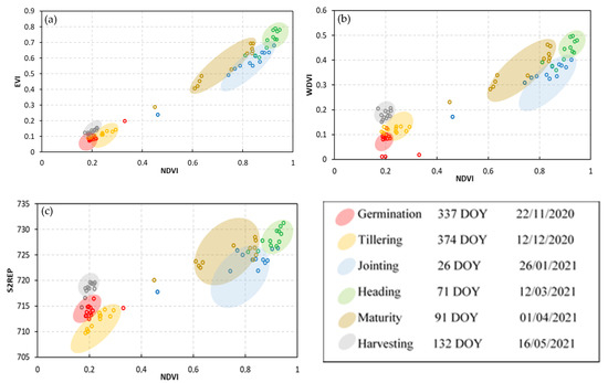 5.3. Scatter Plot of the Field Samples Comprising Optical and SAR Parameters for the Different Phenological Stages