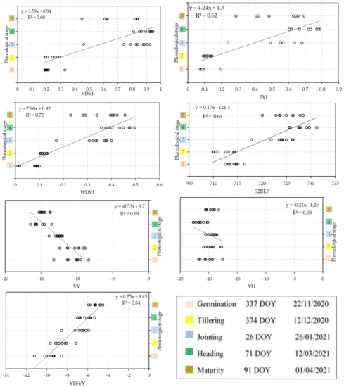 - The optimal models for predicting phenological stages were generated from the WDVI and VH–VV remote sensing indices, resulting in an R2 equal to 0.70 from germination to jointing and an R2 equal to 0.84 from heading to maturity