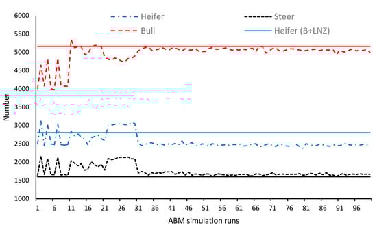 Figure 1 shows that the total number of bulls remained lower than the average reported value (red lines) across 100 runs of ABM. However, the numbers of steers and heifers were above the mean until approximately the 10th run (black and blue lines) before reducing for heifers (Figure 1).