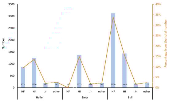The average number of traditional finished heifer, steer, and bull across dam breed types in the ABM (left axis, blue bars) and percentage from the total number (right axis, orange line); HF: Holstein-Friesian; HJ: Holstein-Friesian–Jersey cross, Jr: Jersey and other cattle.