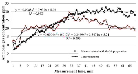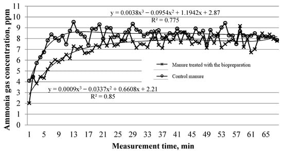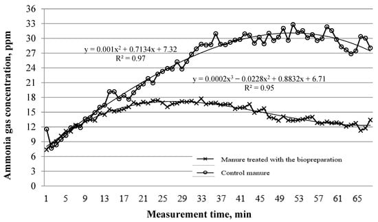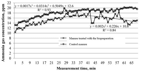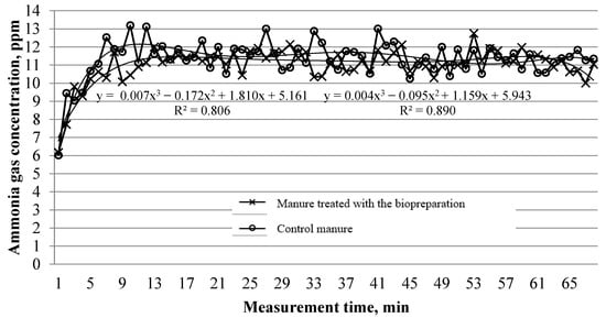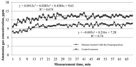Manure was mixed in both chambers, and comparative studies of ammonia emissions were performed. The results are shown in Figure 4. After mixing the manure, the intensity of the ammonia emissions differed less from the two types of manure. In the wind tunnel, the average ammonia concentration over 70 min was 18.1 ppm for the control manure and 15.3 ppm for the manure treated with the biopreparation; i.e., the intensity of the ammonia emissions differed by 15.4%.