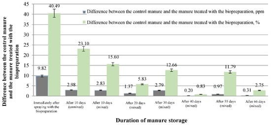 The fact that the concentration of ammonia is lower, and the effect of biopreparation on ammonia release is less can be explained with the building of the crust on the surface of the manure with time. As the manure dries, a crust forms on its outer layer, which acts as a protection against ammonia diffusion [].