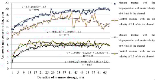 Forty-four days after the first spraying of the biopreparation on the manure surface, the manure was re-sprayed with the biopreparation, and 10 days after the second spraying, comparative ammonia emissions studies were performed by testing the control manure and the manure treated with the biopreparation. Studies were performed by increasing the ventilation intensity of the chamber so that the air velocity in the air duct was increased to 0.7 m/s (Figure 5).