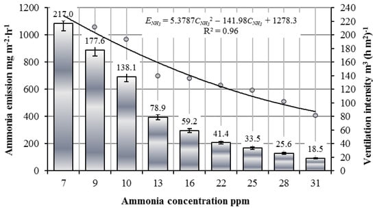 As the ventilation intensity increases, the ammonia concentration in the chamber decreases, and the emission increases rapidly []. As the ventilation intensity increases from 18.5 m3 (h m2)−1 to 217.0 m3(h m2)−1, the ammonia concentration decreases from 31 ppm to 7 ppm, and the emission increases from 406.4 mg m−2⋅h−1 to 1124.2 mg m−2⋅h−1. The researchers found a reliable correlation between the intensity of ammonia emission from manure and the concentration of ammonia above manure, which is expressed as a function of a second-order polynomial (R2 = 0.96) (Figure 9).