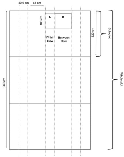 Treatments were randomly assigned to plots and applied in the fall of 2017 to the spring of 2019 in a split-plot design with four replications. There were seven main-plot treatments. Main-plot treatments received one of two between-row termination treatments—cultivation or glyphosate (N-(phosphonomethyl)glycine) herbicide application—each applied at three different timings (spring, fall, or spring + fall). A control without any between-row termination was included. Main plots were divided into three sub-plots, each receiving one of the following suppression treatments—a spring mowing, a fall burning, or a no-suppression control. Experimental units (sub-plots) were 3 m wide with 6 planted rows and 3.2 m long (Figure 1). All within-row biomass and grain yield samples were collected from the two central rows.