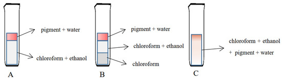 Schematic diagram of the purifying pink pigment with different ratios of the leaching agent and extractant. (A) indicates chloroform and anhydrous ethanol ratios close to 1:1; (B) indicates chloroform and anhydrous ethanol ratios greater than 1:1; (C) indicates chloroform and anhydrous ethanol ratios less than 1:1.