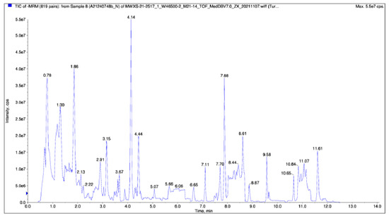 We used Analyst 1.6.3 software to process the mass spectrometry data, we obtained the total ions current (TIC) of the pink pigment sample (Figure 2), and used the multiple reaction monitoring (MRM) to collect the pink pigment sample date (Supplementary Materials Figure S2). At the same time, the MRM scanning was used to obtain the peak area of each compound. In order to compare the material content difference of each metabolite in the sample among all of the detected metabolites, we corrected the mass spectrum peaks according to the information of the metabolites retention time and peak type. By such means, we ensured the accuracy of the qualitative quantification (Supplementary Materials Figure S3) and obtained a final figure for the metabolites detected in the pink pigment solution (Supplementary Materials Table S1).
