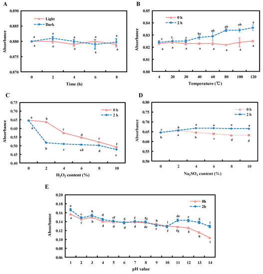 With the increase of the 10% H2O2 content, the absorbance of the pink pigment decreased to varying degrees at 0 h and 2 h. At 0 h, the absorbance of the pink pigment was significantly different from the control (10% H2O2 content was 0) when the content was between 2 and 10% (p < 0.05). At 2 h, when the content was 2%, the absorbance of the pink pigment was 80% of the control, afterwards, although the absorbance continued to decrease, the overall trend did not change much (Figure 3C).