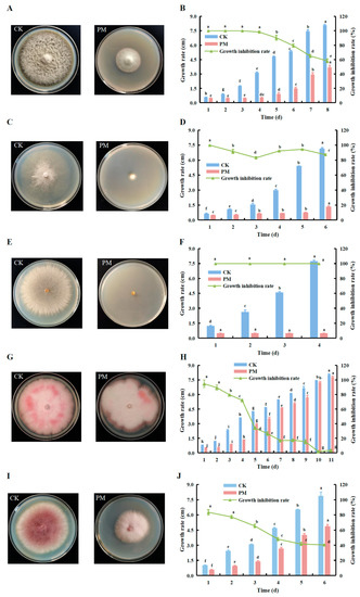 We referred to the research method of You et al. [36], and we used agar punch with a diameter of 0.5 cm to punch mycelial cakes on the same circumference as the edge of the cultured colony, and connected it to the center of the PDA (control) and the PPPDA medium. Three replicates were set up for each group of treatments. All were incubated in the dark at a constant 25 °C maintained by means of a thermostat. We took the time when the edge of the colony of the control group was close to the wall of the dish as the time point. During this period, the diameter of the colony of each treatment was measured using the cross method continuously every day, and the growth rate, and the growth inhibition rate were calculated simultaneously. Three experimental replicates were performed.