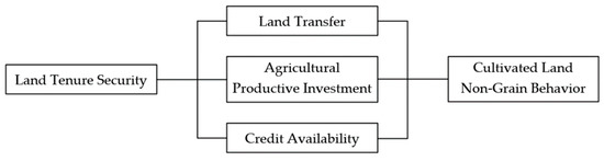 As the essential condition that China’s agricultural production has always relied on, the property rights of agricultural land are the core of the optimal allocation of resources [10]. The land rights system with clear ownership is the cornerstone of agricultural development [11]. In addition, ensuring land tenure security is of great significance to promoting moderate-scale agricultural operations, achieving effective allocation of production factors, and promoting agricultural modernization. A large number of scholars have found that land tenure security has a significant impact on farmland investment [12], cultivated land quality [13], production efficiency [14], and green production [15]. The stability of farmland property rights will lead to changes in agricultural investment and land factor input, ultimately affecting households’ decisions to pursue grain and non-grain planting by affecting farmers’ income. However, few scholars have studied the influence of land tenure security on cultivated land non-grain. Based on this, this paper uses the survey data of micro-farmer households in the main grain-producing areas of the Guanzhong Plain to construct a theoretical analysis framework of “land tenure security—non-grain”. It uses OLS, the mediation effect model, and other econometric models to assess the relationship between land tenure security and cultivated land non-grain. The specific research purposes are: (1) To explore the impact mechanism of the land tenure security on the cultivated land non-grain, in order to provide a reference for preventing excessive control in the management and control of cultivated land use. (2) To provide a new perspective for the study of cultivated land non-grain. (3) To provide decision-making reference for ensuring regional food security.