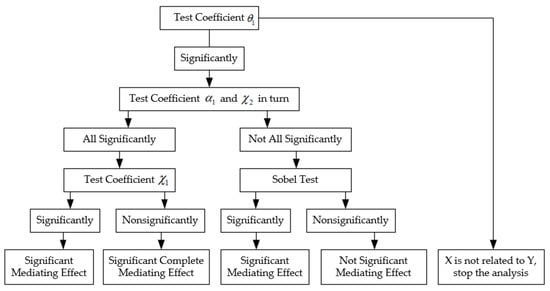 In the above model, is an intermediary variable, representing the land transfer, agricultural productive investment, and credit availability of I farmers. , and are constant terms. , , , , , , and are the coefficients to be estimated. , and are random disturbance terms. Other variables related to model (1) are consistent. The steps to test whether there is a mediation effect are as follows: First, test whether the regression coefficient in Formula (2) is significant. If it is significant, test the coefficients and to determine whether they are notable. If both coefficients are significant, the mediation test has passed, and you can continue to test whether it is significant. Significant means that there is a partial mediating effect, and non-significant implies a complete mediating impact. If at least one of the two coefficients is not significant, the Sobel test needs to be used to judge the existence of the mediating effect. The specific judgment process is shown in Figure 2.