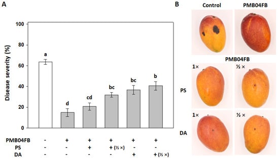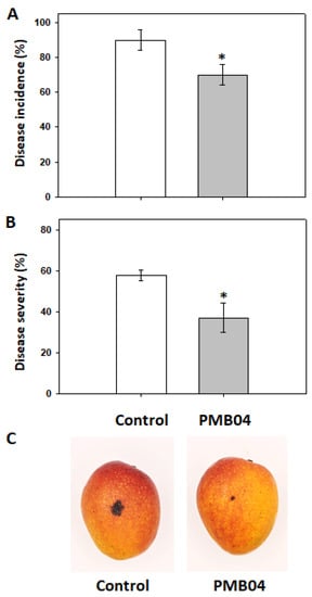 3.2. Anthracnose in Mango Fruit Controlled by Bacterial Suspension of Bacillus amyloliquefaciens PMB04