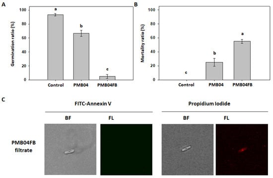 3.3. The Inhibitory Effect of PMB04FB on Germination and Mortality of C. gloeosporioides Conidia