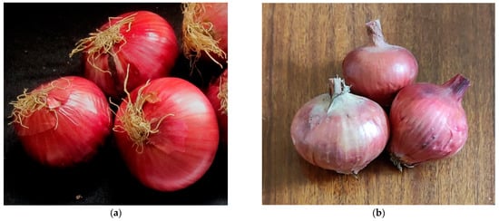 The materials are comprised of ‘Asenovgradska kaba’ cultivar and the red breeding line of onions. The bulbs of ‘Asenovgradska kaba’ are large, flat and round with a very characteristic conical back shape, flat to slightly concave on the neck, and strongly elongated on the bottom, with an index of 0.8–0.9 and a weight of 120–150 g. The sheath scales are colored purple-red. The fleshy inner scales are thick, loose, and purple-red as the outer ones are more intensely colored, and the inner ones are weaker and only on the surface. The red breeding line of onions was created by the method of the individual team. The bulbs are medium-sized and weigh 80–100 g. The outer shells are red. The fleshy inner scales are tightly arranged. The shape of the bulb is flat round with an index of 0.9. The sample images of onion bulbs of ‘Asenovgradska kaba’ cultivar and the red breeding line are presented in Figure 1.