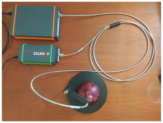 The fiber optic spectrometer allowing the generation of fluorescent emission signals in the range of 200–1200 nm was used in this study (Figure 2). The experimental setup consisted of a portable spectrometer model AvaSpec-ULS2048CL-EVO and a laser diode (optical power 16 mW, emission wavelength 285 nm, DC). The red onion samples were placed on a duralumin stand allowing the reception of an emission signal below 180° of U-shaped optical fiber that reduced aberrations and allowed the generation of a better-quality emission signal (Figure 2). The spectrometer resolution can range between 0.06–20 nm, and that of the setting of 0.09 nm was used for this study. The fluorescence can be often weak and, in all directions, in order not to saturate the receiver, the useful fluorescence signal can be measured in a direction that is below 180° to the excitation radiation. The application of a laser diode (LED) as a source in the circuit is preferable. Its spectral width is small. LED used in this study had a relatively wide spectral width of radiation (about 30–40 nm) and the angular distribution of its radiation was in a large angular range (±30°). The photodetector of the CMOS type model S9132 was chosen for the specific circuit because it can detect emission radiation from red onion bulbs with very high intensity. The sensitivity of the spectrometer ranged from 200 nm to 1200 nm. Its resolution was δλ = 5 nm.