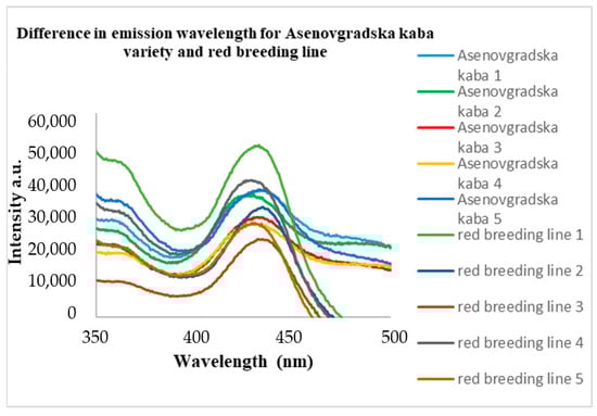 Difference in emission wavelength for ‘Asenovgradska kaba’ variety and red breeding line.