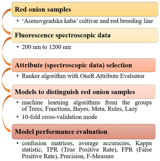 The bulbs of the onion of ‘Asenovgradska kaba’ cultivar and the red breeding line were distinguished using the WEKA machine learning application (Machine Learning Group, University of Waikato, Hamilton, New Zealand) [20,21,22]. There are 5 graphs each from ‘Asenovgradska kaba’ and the red breeding line. A difference in the emission fluorescence signal of ‘Asenovgradska kaba’ and the red breeding line, as well as variety and selection line, is clearly observed. The spectral shift in wavelength and signal intensity level is due to a difference in the content of biologically active substances of a particular variety (Figure 3). The applied procedure of the red onion sample distinguishing is presented in Figure 4.