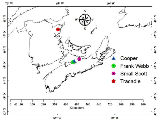 Data about blueberry mechanical harvesting yield losses and the related factors contributing to the yield losses were obtained from four wild blueberry field studies conducted in Nova Scotia. The selected sites were in commercial wild blueberry fields including Frank Webb (45.404733° N, 63.669376° W), Tracadie (47.511270° N, 65.138270° W), Cooper (45.480573° N, 63.573471° W), and Small Scott (45.600641° N, 63.086512° W) having field areas of 2.57, 1.6, 3.2, and 1.9 ha, respectively. While Cooper field and the Small Scott field both were in the year of vegetation in 2010 and their fruit-bearing year in 2011, Frank Webb and Tracadie were in their year of vegetation in 2011 and their fruit-bearing year in 2012. To replicate early and late harvesting, the chosen fields were harvested every year from early August to early September using a mechanical blueberry harvester (Doug Bragg Enterprises Ltd., Collingwood, NS, Canada). Figure 1 displays the geolocation of the chosen fields. The chosen fields had undergone biennial trimming by mowing as well as traditional farming management techniques, and they had been commercially managed for the previous ten years (fertilization, pruning, weed, disease, and pollination).