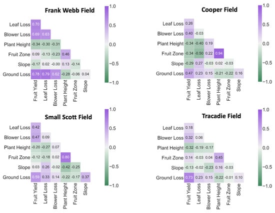 In order to identify the relationships in between ground losses and other input variables, correlation matrices were established. The Pearson correlation’s results have been shown in Figure 2. In the Frank Webb field, there were strong significant, and positive correlations between ground loss and fruit yield (r = 0.78), and leaf loss (r = 0.79). Farooque [] reported that the fruit losses on the ground enhanced with an increment in the blueberry yield during the harvesting. There was a moderate correlation between ground loss and blower loss (r = 0.62). The ground loss was negatively correlated with plant height (r = −0.28) and fruit zone (r = −0.06) which means that ground loss decreased while plant height and fruit zone increased and vice versa. It has also been reported by [] that the ground loss was inversely proportional to plant height (r = −0.21) and fruit zone (r = −0.07). The slope had a positive correlation with ground loss (r = 0.04). In the Cooper field, the ground loss had a moderate positive correlation with fruit yield (r = 0.47). It was due to the topography of the field and the size of berries. The remaining variables had a weak correlation i.e., r ≤ 0.35. In the Small Scott field, ground loss and fruit yield were positively correlated (r = 0.59). Leaf loss, blower loss, and slope also had a positive correlation with ground loss i.e., r = 0.33, 0.14, and 0.37, respectively. In the Tracadie field, a significant correlation between ground loss and fruit yield was observed (r = 0.73). Leaf loss, blower loss, and slope were weakly correlated with the ground loss which means that r ≤ 0.35 for these variables. [] concluded that ground loss had a significant correlation with fruit yield (r = 0.78) but it had a weak correlation with blower loss (r = 0.15) and slope (r = 0.16). Plant height and fruit zone represented a reverse relationship with the ground loss.