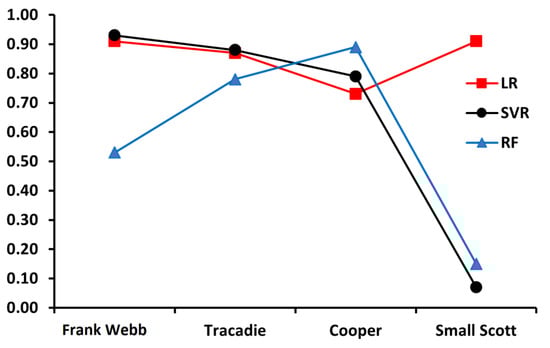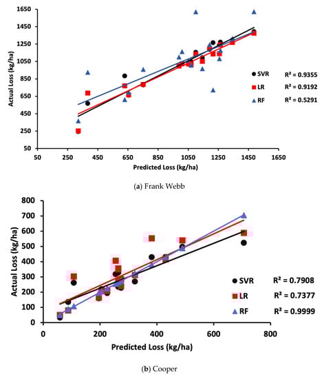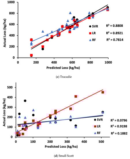 The outcomes of the model assessment have been given in the Table 4. SVR had a higher R2 (0.93) for Frank Webb field; LR recorded R2 = 0.91 whereas, the lowest R2 (0.53) was recorded for RF in this field. The ranges of MAE and RMSE were 2.35–2.49 and 2.96–3 kg/ha respectively for all the algorithms in this field. In the Tracadie field, high R2 was recorded for LR and SVR which were 0.87 and 0.88 respectively, whereas, RF had R2 = 0.78. The values of MAE and RMSE for this field ranged from 10.74–34.32 and 13.08–45.15 kg/ha, respectively. In Cooper field higher R2 (0.89) was observed for RF whereas, for LR and SVR, the values of R2 were 0.73 and 0.79, respectively. Lowest values of MAE and RMSE were calculated for SVR i.e., 0.1 and 0.15, respectively in this field. In the Small Scott field higher R2 value was recorded for LR (0.91), and the lowest SVR and RF were recorded at 0.07 and 0.18 for this field, respectively. The highest MAE and RMSE were observed for RF i.e., 53.76 and 103, respectively. The findings revealed that the SVR and LR performed very well in predicting the berry losses (Table 4). Wang [] compared the performance of the RF algorithm with SVR and artificial neural network (ANN) to remotely estimate the wheat biomass and reported that RF (R2 = 0.79) and SVR (R2 = 0.62) showed good results as compared to ANN (R2 = 0.3). Gandhi [] used different machine learning techniques and reported that SVR performed very well for the prediction of rice crop yield under different climatic scenarios. Palanivel [] used diverse machine learning techniques such as LR, ANN, and backpropagation methods to predict the crop yield. In order to develop a prediction model for fruit yield, Obsie [] selected four ML models, that are boosted decision trees, multiple linear regression, extreme gradient boosting, and RF, and concluded that RF was the second-most successful algorithm, accompanied by the Boosted Decision Tree algorithm with R2 = 0.90.