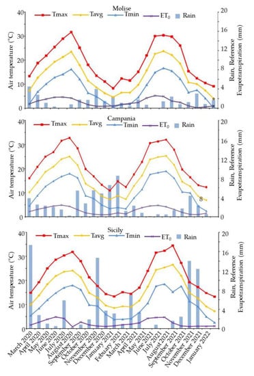 Monthly maximum, average, and minimum temperatures, as well as rainfall and reference evapotranspiration values, are reported in Figure 1. In Molise and Campania, the climate is characterised by cold winters and mild summers. Moreover, the rainfall in these areas is fairly uniform throughout the year, with significant amounts occurring in late spring and summer. Comparing these two regions, annual rainfall is higher in Campania than in Molise. In Sicily, the vineyards are on the eastern slopes of the Etna volcano. This region shows a highly seasonal rainfall pattern. The highest rainfall was registered during the first year; however, a long period of drought generally occurs during the period that corresponds to the phenological stages of late flowering, berry set, veràison, and berry ripening. In the first year, despite a large amount of rain in August 2021, the subsequent dry period was very long (120 days). The pHs of the investigated soils were moderately alkaline (pH 8.3) at the Molise site, and neutral in Campania and Sicily (pH 7.1 and 7.0, respectively). All of the soils were classified as non-saline (Ec 0.135 dS−1, 0.047 dS−1, and 0.034 dS−1 in MOL, CAM, and SIC, respectively). The soil–water regimes during the growing season indicated differences in water availability for vines between the monitored sites (MOL > CAM > SIC), in accordance with the specific soil characteristics and climates (Table 1).