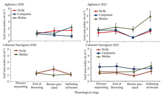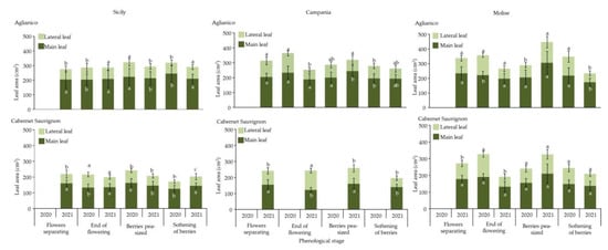 In both years, at each phenological stage, the leaf areas from the main shoots were always higher for AGL (Figure 4). In CAB, for the leaves on the lateral shoots in MOL and CAM at end of flowering in 2020, and in MOL at the pea-sized berries stage and at berry softening stage in 2021, the leaf areas were higher than those for the main shoots. In SIC, the lowest leaf area values were recorded for both the main and the lateral shoots.