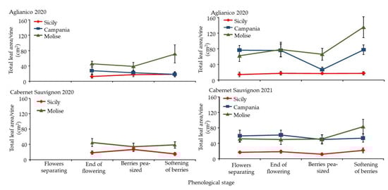 Concerning the total leaf area per vine (Figure 5), AGL in MOL, during the first year at each phonological stage, showed significantly higher values. During the second year, except at the pea-sized berries stage, the vine behaviour was similar between CAM and MOL. In SIC, no differences were recorded between the different stages. For CAB, the trends for total leaf area per vine were similar to those for AGL.