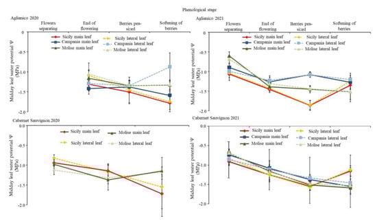 Midday leaf water potentials measured on main and lateral leaves recorded in each of two cultivars, Aglianico (AGL) and Cabernet Sauvignon (CAB), grown in three different sites, Molise (MOL), Campania (CAM), and Sicily (SIC). Measurements were made at the phenological stages BBCH57 (only second year) flowers separating, BBCH69 end of flowering, BBCH75 berries pea-sized, and BBCH85 softening of berries (bars indicate one standard deviation), based on Tukey’s HSD test within sites and years.