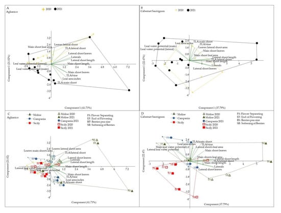 A PCA was carried out in order to evaluate the effects of site on vine development (Figure 8A–D). A clear separation was observed between MOL and SIC in both years. In SIC, the parameters appear in the negative quadrant of component 2 as a consequence of the highly negative water potential. The morphological results for SIC are lower than in MOL or CAM. A similar trend was detected in MOL for midday leaf water potential of CAB at the pea-sized berry stage, and of AGL at the flower separation stage. For AGL (Figure 8B), component 1 accounted for 41.73% of the explained variance, while component 2 accounted for 21.02% of the explained variance. This shows that AGL-SIC and AGL-CAM follow a similar trend in the negative quadrant of component 1 as a result of the negative water potential. In MOL, except at the flower separation stage in 2021, all the parameters separate into the positive quadrant for component 1. For CAB (Figure 8B,D), component 1 accounted for 37.79% of the explained variance, while component 2 accounted for 22.45% of the explained variance.