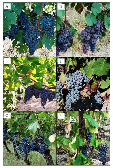 Bunches of the two cultivars, Cabernet Sauvignon (CAB) and Aglianico (AGL), grown in three different sites, Molise (MOL), Campania (CAM), and Sicily (SIC). (A): CAB MOL; (B): CAB CAM; (C): CAB SIC; (D): AGL MOL; (E): AGL CAM; (F): AGL SIC.