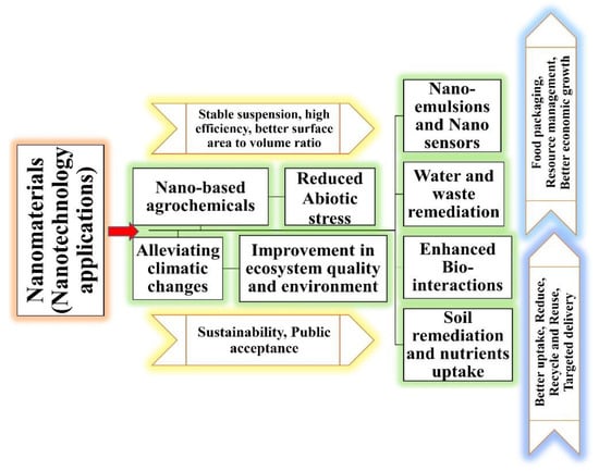 The agriculture sector has always remained the most stable and potential sector for being the major source of materials to food industries for sustainable growth and development. Due to the growing population and limited natural resources, there is an urgent demand for efficient, feasible, and eco-friendly agricultural expansion. However, the agriculture sector has numerous challenges including a reduction in crop yield, climatic change, depletion of soil nutrients, water scarcity, reduced soil fertility, crop diseases, and inadequate manpower [1,2,3]. Scientists are struggling to elucidate other potential technologies for narrowing the current food demand by enhancing the supply chain. Nanotechnology has emerged as one of several promising technologies which can further ameliorate agricultural productivity by utilizing efficient pesticides, herbicides, and nano-fertilizers, regulating soil nutrition, and wastewater remediation [4,5,6]. It has shown remarkable advancements in several domains such as industrial food processing with better food productivity and nutritive enhancement along with strong antimicrobial competency. Agricultural advancements mainly rely on climatic changes, ecosystem processes, social inclusion, and natural resources [7]. Therefore, there is an imperative necessity to continue advancements in the agriculture domain for combating serious issues such as poverty and hunger. The United Nations (UN) has also emphasized sustainable agriculture and incorporated it as one of its sustainable development goals [8]. Agricultural sustainability has always been a central concern due to its longstanding consequences for national economics and food production [9]. Sustainability in agricultural practices comprises efficient usage of soil nutrients, water resources, proper handling of agro wastes, minimal use of fertilizers, plant disease control, and advanced farming techniques [10]. It can only be assessed based on certain parameters such as technological innovations, fund availability to farmers, and involvement in research and development for developing advanced techniques. Nanotechnology offers a wider potential in achieving sustainable agriculture sectors by enhancing the efficacy of agricultural inputs, thereby increasing food production and improving crop yield. This would simultaneously lead to environmental sustainability, ecological balance preservation, and economic stability [11,12].