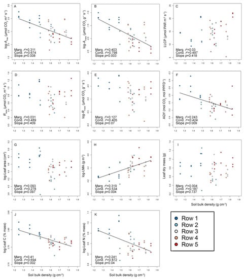 Relationships between 11 ‘Chardonnay’ leaf traits and soil bulk density. Relationships are presented for: light-saturated maximum photosynthetic rate on a per leaf area basis (Amax, Panel A); light-saturated maximum photosynthetic rate on a per leaf mass basis (Amass, Panel B); leaf-level light compensation point (LLCP, Panel C); leaf respiration rate on a per leaf area basis (Rarea, Panel D); leaf respiration rate on a per leaf mass basis (Rmass, Panel E); apparent quantum yield (AQY, Panel F); leaf area (Panel G); leaf mass per unit area (LMA, Panel H); lead dry mass (Panel I), leaf carbon (C) concentration (Panel J); and leaf nitrogen (N) concentration (Panel K). Trend lines correspond to statistically significant relationships (where p ≤ 0.05 for the slope parameter) between each trait and bulk density, based on linear mixed effects models predicting traits as a function of soil bulk density (as a fixed factor) while accounting for plant identity (as a random factor; see Table S2 for full model diagnostics and fits). Also presented are marginal r2 values (“Marg. r2”) for each relationship, which represents the proportion of variation in a given trait explained by fixed factors alone (i.e., bulk density and model intercept), and condition r2 values (“Cond. r2”), which represent the proportion of trait variation explained by fixed and random factors. Sample sizes for all models were 45 leaves, measured across 15 individual vines. Log-transformed trait values were used in models according to results presented in Table 1, and trait acronyms are presented in Table 1.