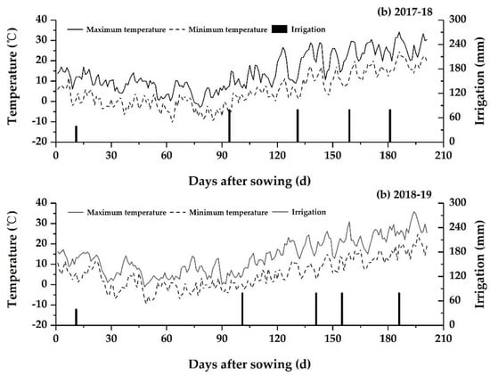 A two-year field experiment was conducted at the Water-Saving Park of Hohai University (118°50′ E, 31°57′ N) during the winter wheat growing season (from November 2017 to June 2018 and from November 2018 to June 2019). The climate of the experiment region was characterized by a subtropical monsoon climate with an annual average temperature of 15.3 °C, mean annual precipitation of 1073 mm, and mean annual evaporation of approximately 900 mm [38]. The daily meteorological data during the two winter wheat growing seasons were recorded by an automatic weather station at the experiment site (Figure 1).