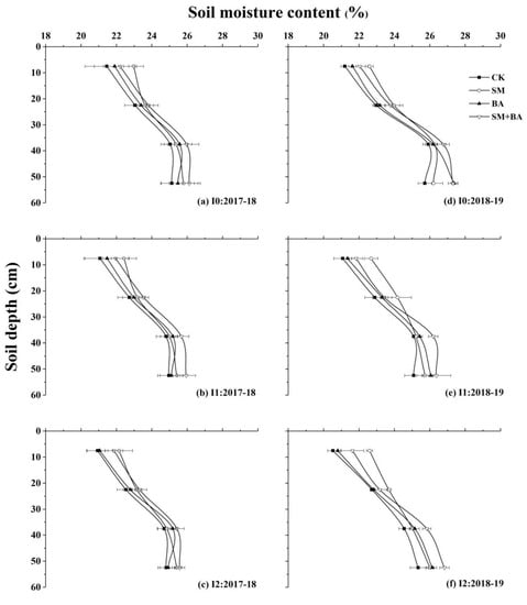 Vertical distribution of soil moisture content within the 0–60 cm soil profiles under different straw-returning modes and irrigation water salinity levels at the time of winter wheat harvest during the 2017–2018 and 2018–2019 growing seasons, respectively. The values are means of three replications ± standard deviation. CK: no straw-returning, SM: straw mulching, BA: biochar amendment, SM+BA: straw mulching with biochar amendment; I0, I1, and I2 indicate an irrigation salinity of 0.47 dS m−1, 3.25 dS m−1, and 6.75 dS m−1, respectively.