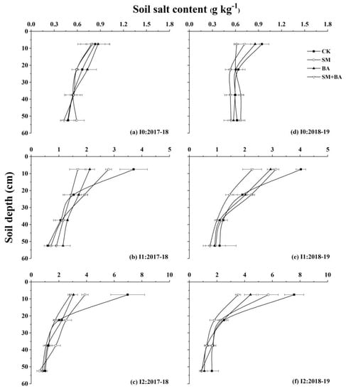 Vertical distribution of soil salt content within the 0–60 cm soil profiles under different straw-returning modes and irrigation water salinity levels at winter wheat harvest during the 2017–2018 and 2018–2019 growing seasons, respectively. The values are means of three replications ± standard deviation. CK: no straw-returning, SM: straw mulching, BA: biochar amendment, SM+BA: straw mulching with biochar amendment; I0, I1, and I2 indicate an irrigation salinity of 0.47 dS m−1, 3.25 dS m−1, and 6.75 dS m−1, respectively.