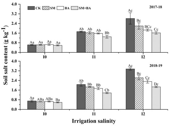 The effects of straw-returning modes and irrigation water salinity on soil salt content in 2017–2018 and 2018–2019, respectively. The values are means of three replications, ± standard deviation. For each growing season, different uppercase and lowercase letters indicate a significant difference (p < 0.05) among straw-returning modes (for a given irrigation regime) and irrigation water salinity levels, respectively. CK: no straw-returning, SM: straw mulching, BA: biochar amendment, SM+BA: straw mulching with biochar amendment; I0, I1, and I2 indicate an irrigation salinity of 0.47 dS m−1, 3.25 dS m−1, and 6.75 dS m−1, respectively.