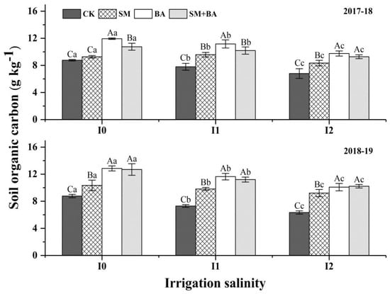 The effects of the straw-returning modes and irrigation water salinity on soil organic carbon (SOC) levels in 2017–2018 and 2018–2019, respectively. The values are means of three replications ± standard deviation. For each growing season, the different uppercase and lowercase letters indicate a significant difference (p < 0.05) among straw-returning modes (for a given irrigation regime) and irrigation water salinity levels, respectively. CK: no straw-returning, SM: straw mulching, BA: biochar amendment, SM+BA: straw mulching with biochar amendment; I0, I1, and I2 indicate irrigation salinity levels of 0.47 dS m−1, 3.25 dS m−1, and 6.75 dS m−1, respectively.
