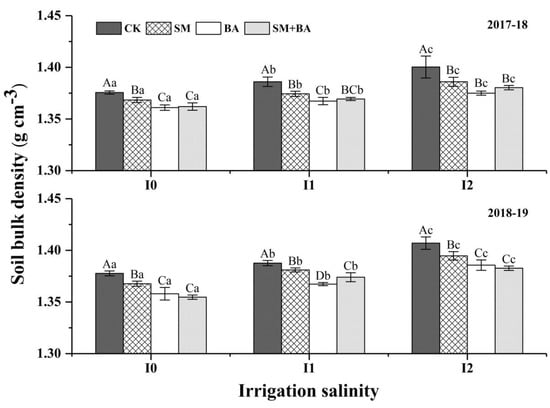 Effects of straw-returning modes and irrigation water salinity on the soil bulk density (BD) in 2017–2018 and 2018–2019, respectively. The values are the means of three replications ± standard deviation. For each growing season, the different uppercase and lowercase letters indicate a significant difference (p < 0.05) among the straw-returning modes (for a given irrigation regime) and irrigation water salinity levels, respectively. CK: no straw-returning, SM: straw mulching, BA: biochar amendment, SM+BA: straw mulching with biochar amendment; I0, I1, and I2 indicate irrigation salinity levels of 0.47 dS m−1, 3.25 dS m−1, and 6.75 dS m−1, respectively.