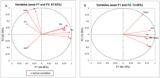 Principal component analysis was applied to nine germination and six emergence variables to examine the relationship among these variables (Figure 1A, Table 10). The first two principal components (PCs) explained 44.69% (PC1), 21.34% (PC2) in root length and shoot length for seedling germination variables, while 60.16% (PC1), 13.39% (PC2) in root and shoot length for the seedling emergence variables (Figure 1B). The PC1 in root length for germination variables was robustly weighted in SL, FM, MGT, GVI, R:S, FG and VI, contributing 44.69% to the total variance, followed by the SL contributing 22.34% to the total variance (Table 10). Likewise, the PC1 in root length in seedling emergence was strongly weighted in MET, EVI and FE contributing 60.17%, 13.39% and 10.98% to the total variance, respectively (Table 11). The data set showed components were extracted with a cumulative percent of 67.03% and 73.55% of the total variance in seedlings root and shoot, for both the germination and emergences indices, respectively (Figure 1A,B). The first component in Table 10 demonstrated significantly strong positive rotated component matrix loadings of RL (1.78), SL (1.48) and FM (1.32), for the germination variables. Similarly, in the emergence dataset, the first component showed significantly strong positive rotated component matrix loadings of MET (3.46) and EVI (1.76) (Table 11).