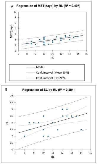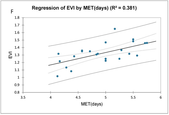 The linear regression was carried out only on the emergence indices. A moderate relationship with the temperature regimes were observed among the selected indices (Figure 2). The linear regression of MET and RL (Figure 2A) indicates that as the speed of emergence (MET) increased there was a slight increase in root length, while an increase in root length moderately enhanced the shoot length (Figure 2B), and emergence velocity index (Figure 2C). The regression slope was moderately higher in seedling fresh mass which led to an increase in the speed of emergence i.e., MET and EVI (Figure 2D,E). The mean emergence time and emergence velocity index which represents the speed of germination shows a linear regression (Figure 2F).