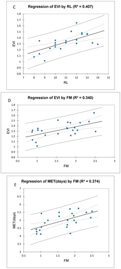 The linear regression shows the interaction between (A) = root length (RL) and mean emergence time (MET), (B) = RL and shoot length (SL), (C) = (RL and emergence velocity index (EVI), (D) = EVI and fresh mass (FM), (E) = FM and MET, and (F) = EVI and MET of okra seedlings exposed to coating and pollination.