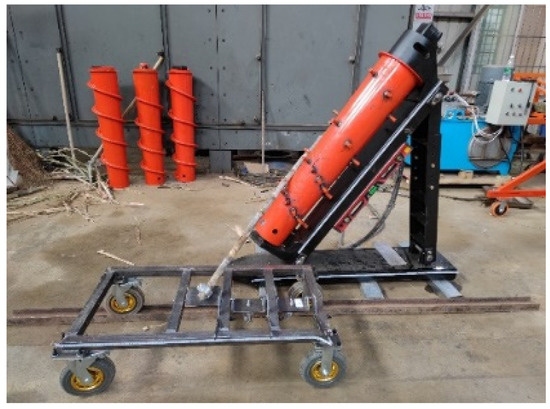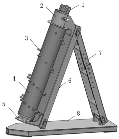 Figure 1, the crop divider test platform consisted of a hydraulic motor, an upper bracket, spike teeth, a spiral scroll, a lower bracket, a left bracket, a right bracket, and a bottom base. The spiral scroll was installed on the left bracket through the upper and lower bracket. A row of positioning pin holes was punched on the side of the right bracket, which was composed of two sections. The hydraulic motor was installed on the upper end of the spiral scroll. A bearing was installed between the scroll and the bracket; the length of the right bracket could be adjusted through the pin hole. The hydraulic motor was installed on the spiral scroll through the bearing and the spikes were welded to the surface of the spiral scroll in a spiral manner. The main technical parameters of the test bed are shown in