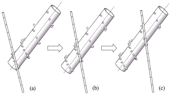 Lifting process of spike-toothed crop divider: (a) the sugarcane and the scroll were just in contact, (b) the rising process of the sugarcane, (c) the late stage of the sugarcane lifting.