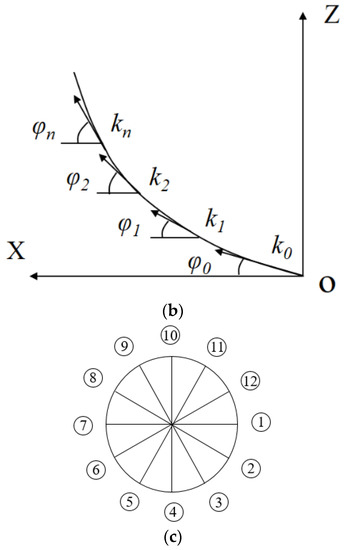 Spiral analysis: = a moving point on a spiral; = spiral angle; = spiral pitch; = angular velocity of scroll; (a) Formation of a variable spiral, (b) Expanded view of a variable spiral, (c) Reference line of spiked teeth.