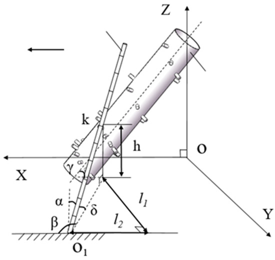 Schematic diagram of sugarcane lifting: = lodging angle; = side angle; = installation angle of scroll; = lifting angle; = contact point between sugarcane and scroll.