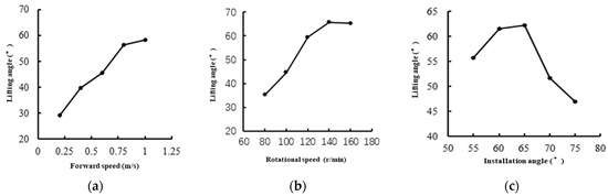 Results of single-factor test: (a) Effect of forward speed on lifting angle, (b) Effect of rotational speed on lifting angle, (c) Effect of installation angle on lifting angle.
