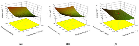 Figure 7a, the lifting angle of lodged sugarcane had an overall upward trend with an increase in the forward speed. The lifting angle had an obvious upward trend in the range of 0.4~0.8 m/s. When the forward speed was low, the lifting efficiency also was low. In the later stage of lifting, as the spiral rise angle of the arranged spiked teeth gradually increased, the lifting height increased in per-unit time, which caused the lifting angle of the sugarcane to also increase.